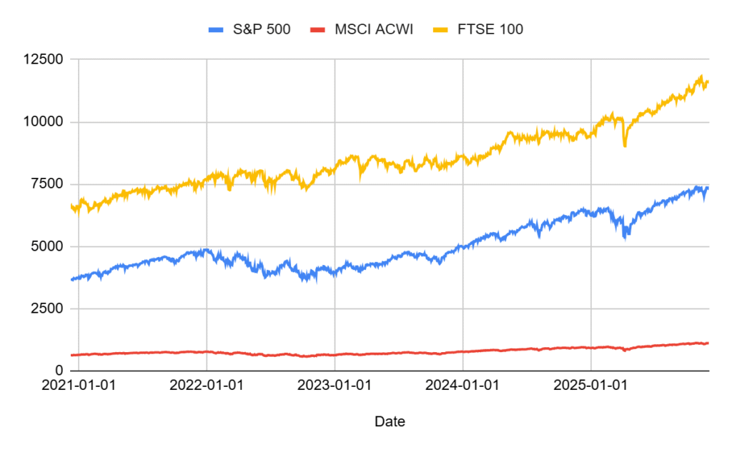 S&P 500, FTSE 100 and MSCI All Country World Index 5-year stock market performance