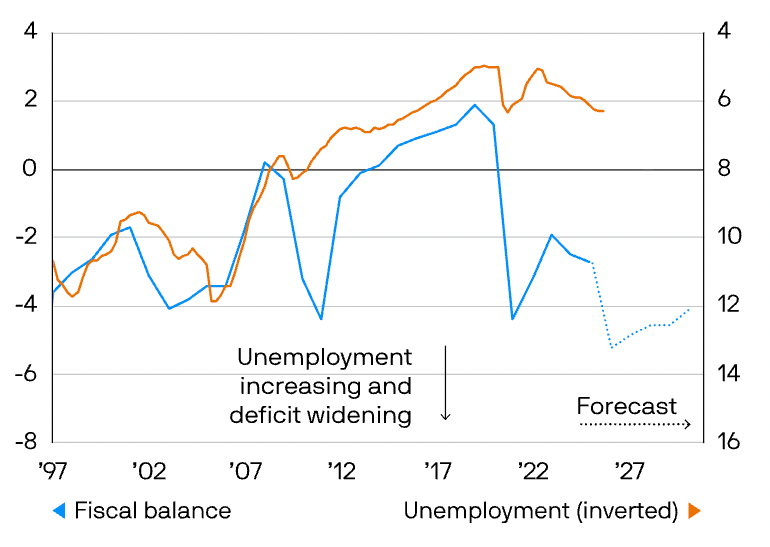Source: Bloomberg, Destatis, J.P. Morgan Asset Management. The fiscal balance forecast is from Destatis. Data as of 31 October 2025.
