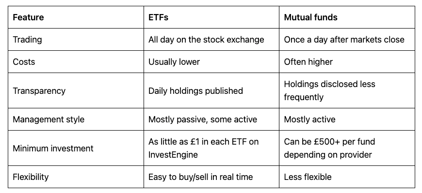 A lot of investment platforms, like Hargreaves Lansdown, offer mutual funds as a core of their portfolios. At InvestEngine, we prefer ETFs. The two are similar, but there are some key differences you should be aware of.